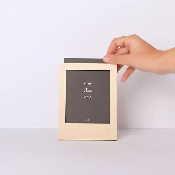 Een leuke kaarthouder voor A6 format, gemaakt van hout, in de vorm van een fotolijstje (zonder glas).